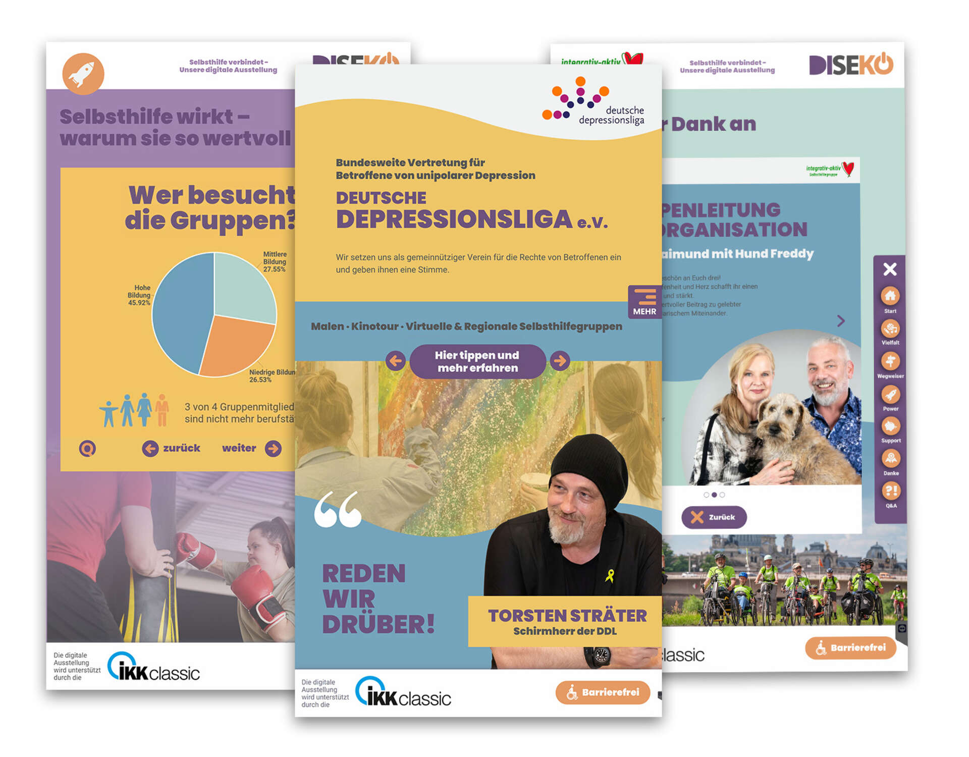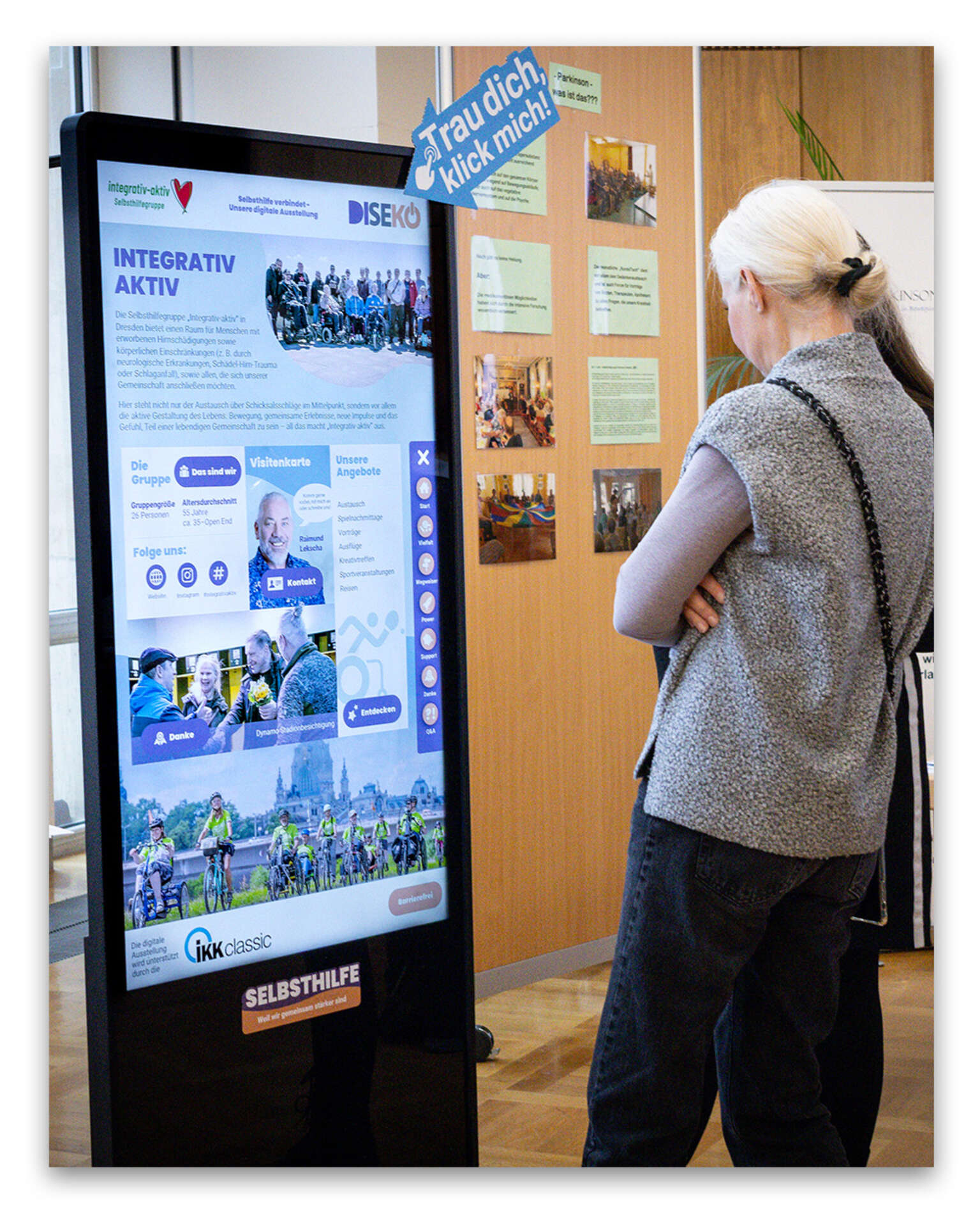 Mit freundlicher Unterstützung der IKK classic ist eine digitale Ausstellung zur Stärkung der Selbsthilfe durch Sichtbarkeit, Vernetzung und gesellschaftlicher Wertschätzung entstanden. Ziel ist es, durch interaktive Stelen im öffentlichen Raum auf lebendige und anschauliche Weise über die Selbsthilfe, ihre vielfältigen Angebote sowie Wege zur Kontaktaufnahme und Unterstützung zu informieren. Regionale und digitale Selbsthilfegruppen-, Vereine und Engagierte haben dabei die Möglichkeit, sich und ihre Arbeit vorzustellen und neue Mitglieder zu gewinnen. Wir lassen die Vielzahl an Geschichten und Begegnungen in Einzelportraits, Videos, Fotoreportagen und interaktiven Fotostory lebendig werden. Auf Wunsch bringen wir uns mit Kreativworkshops in das Angebot mit ein.