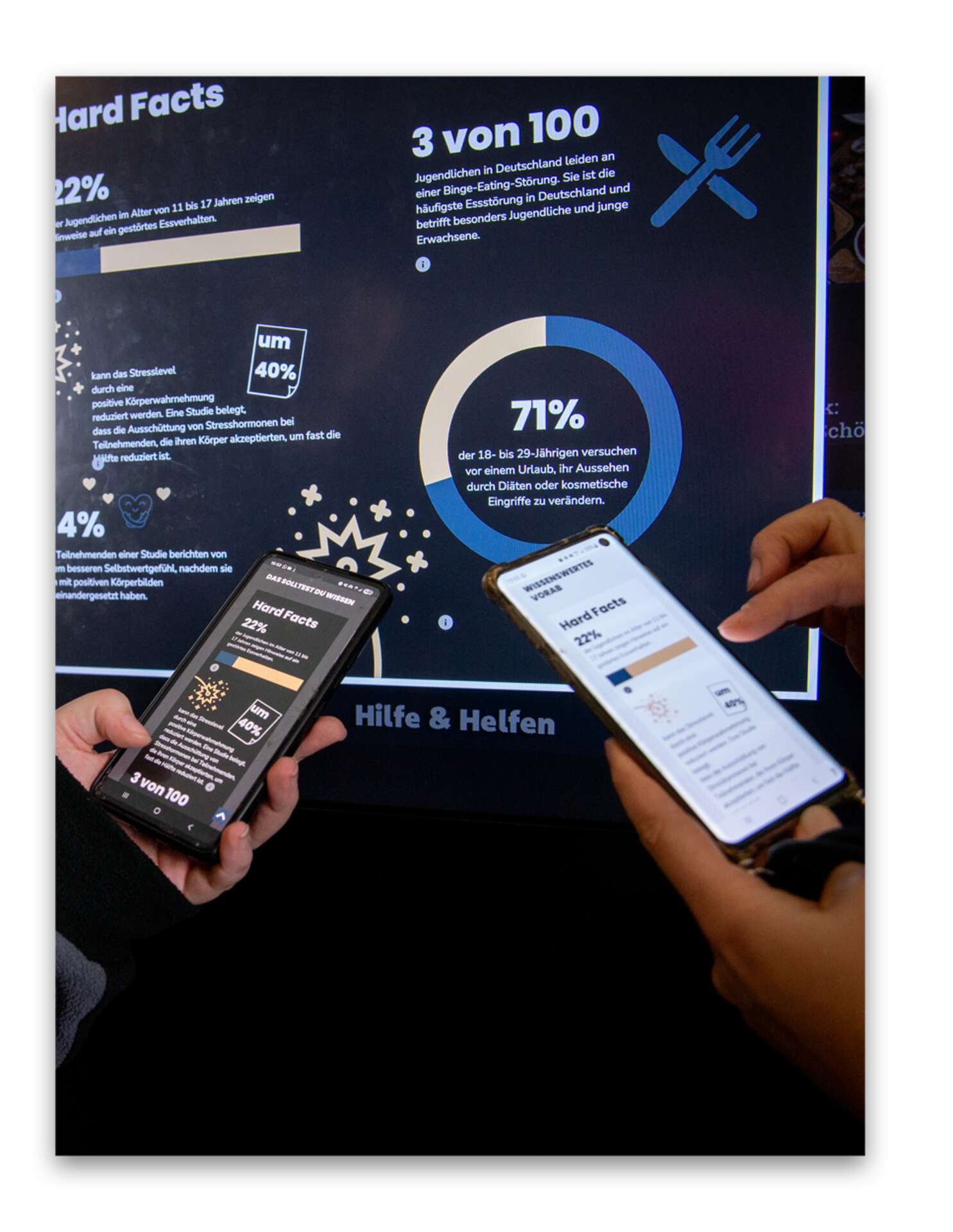Dabei sind wir mit der digitalen Ausstellung mittendrin im trubeligen Schulleben: im Eingangsbereich, vor der Mensa oder in der Bibliothek. Darüber hinaus bieten zwei ergänzenden Websites, je eine für Jugendliche und eine für pädagogisches Personal, zu jedem Thema aus der digitalen Ausstellung noch mehr Input: u.a. konkrete Hilfs- und Beratungsangebote, altersgerechte Medienempfehlungen sowie qualitätsgeprüfte Angebote und Informations- bzw. Unterrichtsmaterialien – alles frei zugänglich, übersichtlich gestaltet und an einem Ort gebündelt.