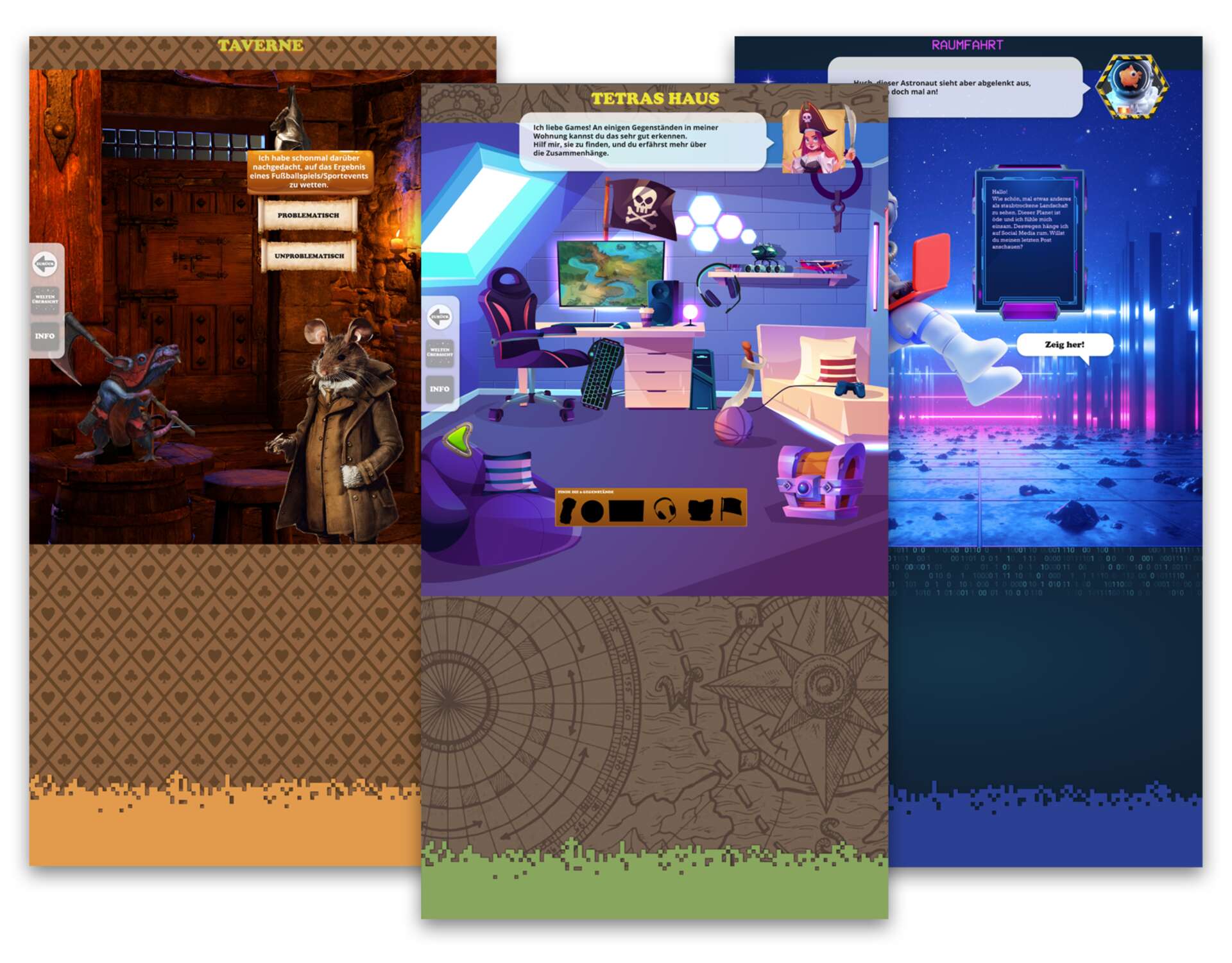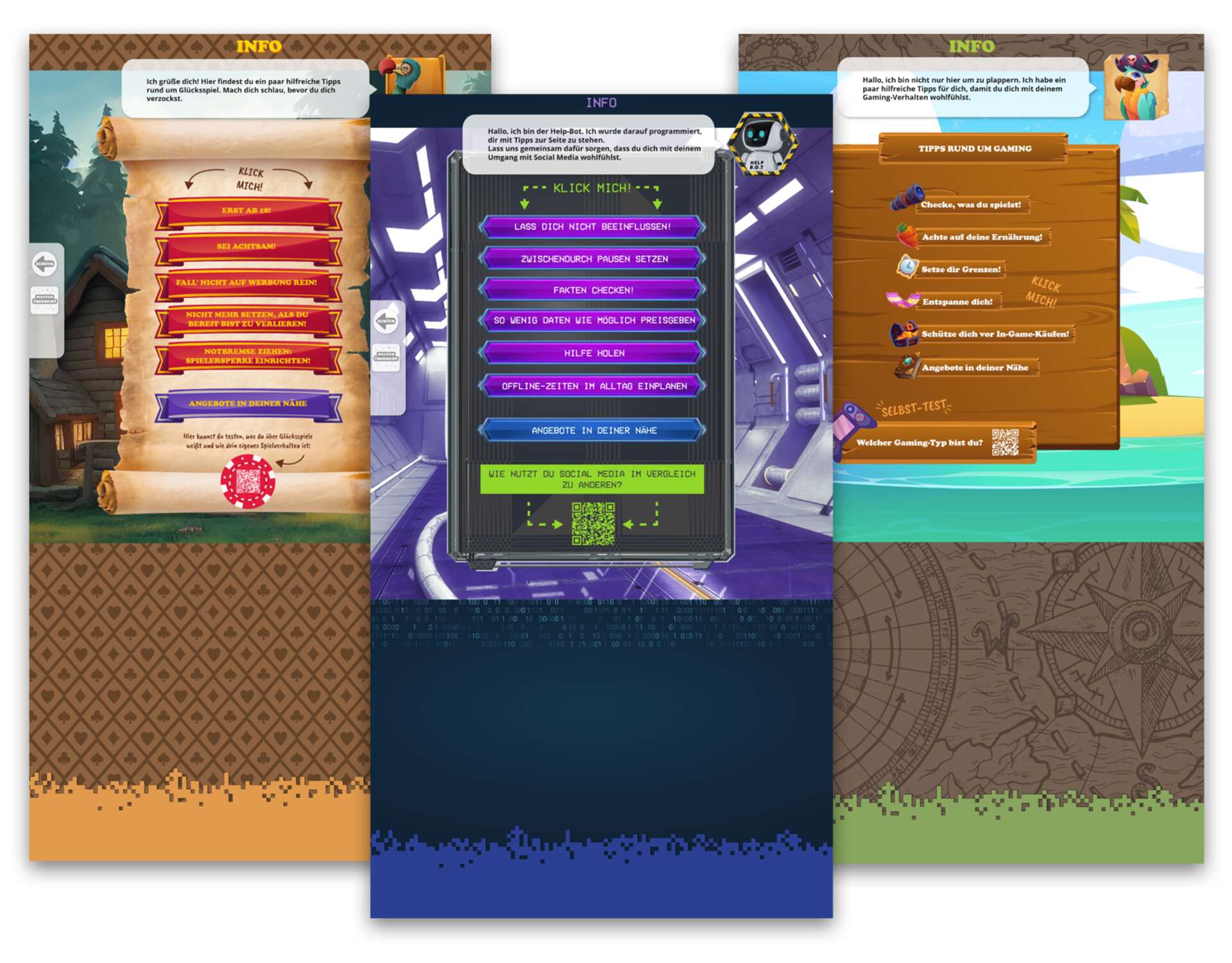Mit den unterschiedlichen Zocken.Gamen.Suchten.-Elementen können interaktiv und spielerisch fundierte Aufklärungsinhalte zu den Themen Glücksspiel, Zocken und Social Media kennengelernt werden.
